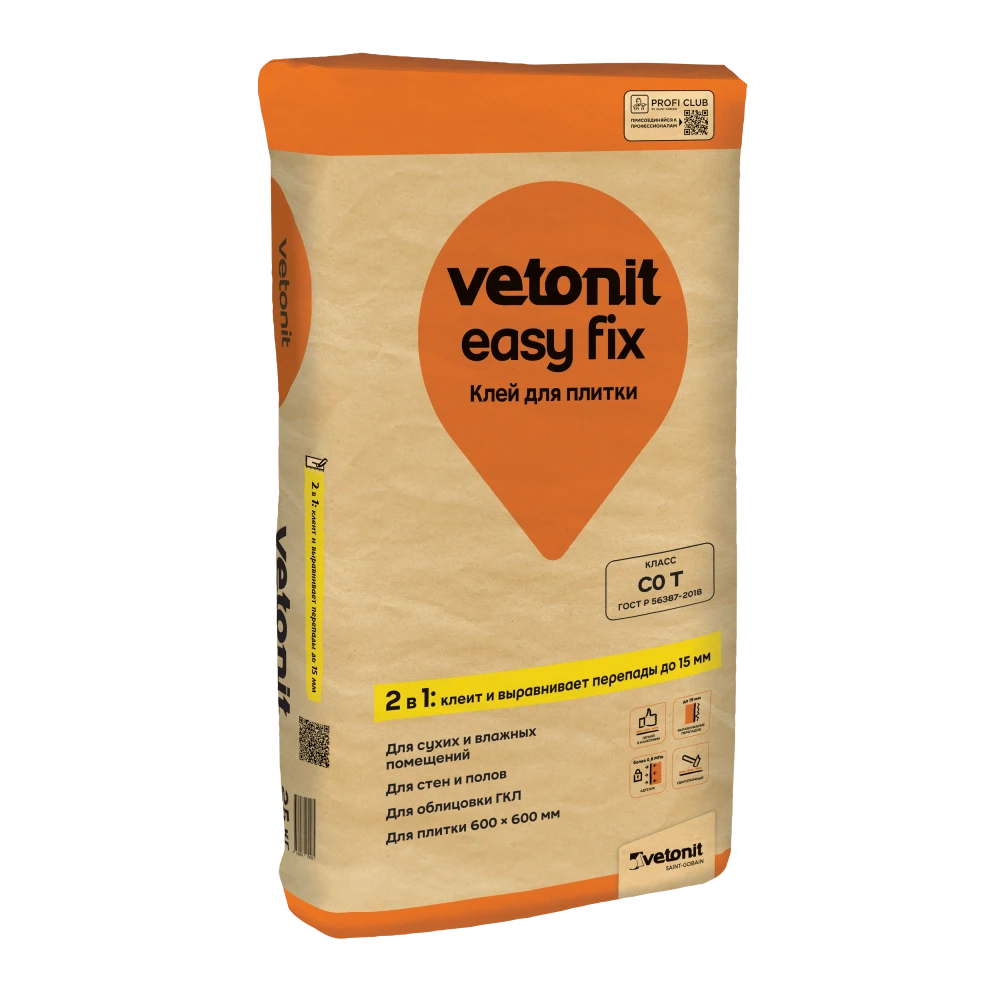 Vetonit Easy Fix - пожаробезопасный, влагостойкий устойчивый к плесени, грибкам и бактериям. Пластичность удобство в работе отсутствие сползания плитки, надёжная фиксация и легкое замешивание, - вот всё то, за что этот клей так любят мастера.